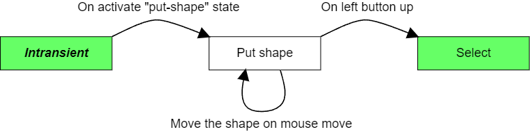 Which state would we like to activate ‘put shape’ from? We have had the answer, of course. It should be any intransient states because the new shape button should be available to us whenever we are in an intransitive state. After putting a new shape on the canvas, probably we’d like to select the newly created shape for further operations. So put shape state is a transient state and let us move to select state consecutively.