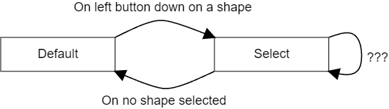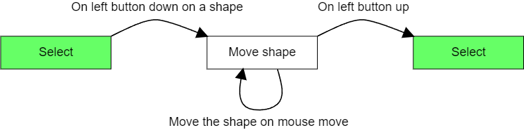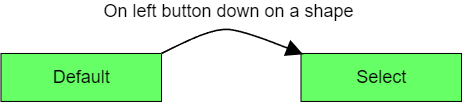 Either way, we do left button down on a shape at first. Then, if we drag, the state should change to move state. If we don’t drag and release the button, the state should change to select state. It seems we need to have a flag to track if we hold the button and wait the next action while the flag is on.