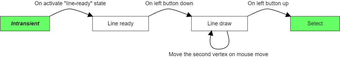 As you see, it appears we need two new states to achieve these steps. Let’s name them line ready state and line draw state. Likewise put shape state, we should be able to activate the first state anytime the button is available to us. That means the state should be able to be activated from any intransient states.