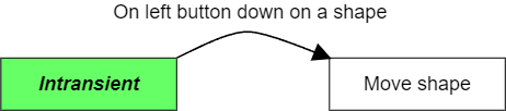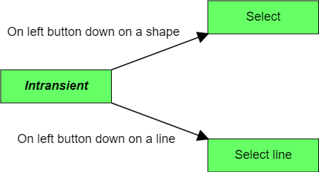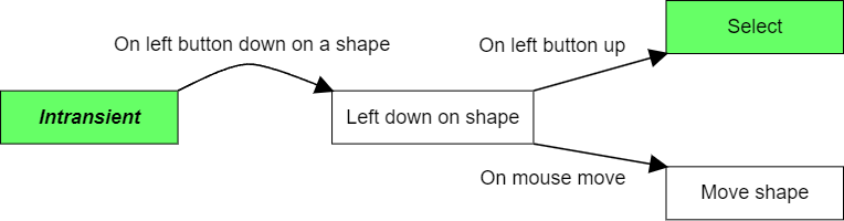 What the heck is intransient state? Good question and there’s no definitive definition for it since it just came up to my mind as I wrote this article. The idea is simple. A state is intransient if it handles some events to activate conventional operations. What the heck are conventional operations then? There’s no definitive definition as well though, I can list up some examples such as “panning”, “(de)selecting shapes”, “moving shapes”, “undo/redo” etc. I hope you can see the idea from these examples.