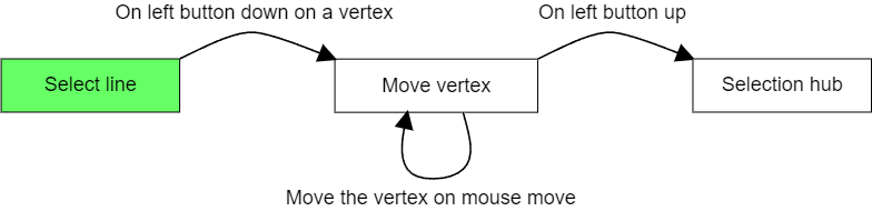 Might as well, we feel like moving a vertex! Problem detected, which state can we activate move vertex state from? The activation event is surely left button down on a vertex, it seems easy enough. We can suppose that the line we are about to edit should be selected in advance. A line is certainly a kind of shapes, so that we should be in select state when a line is selected.