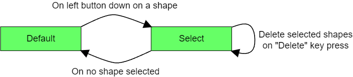 As long as select state checks shapes’ selection status correctly, all we need to do is just adding the handling for the event "Delete" key press. Then, select state takes care of the state transition as shapes’ selection status changes.